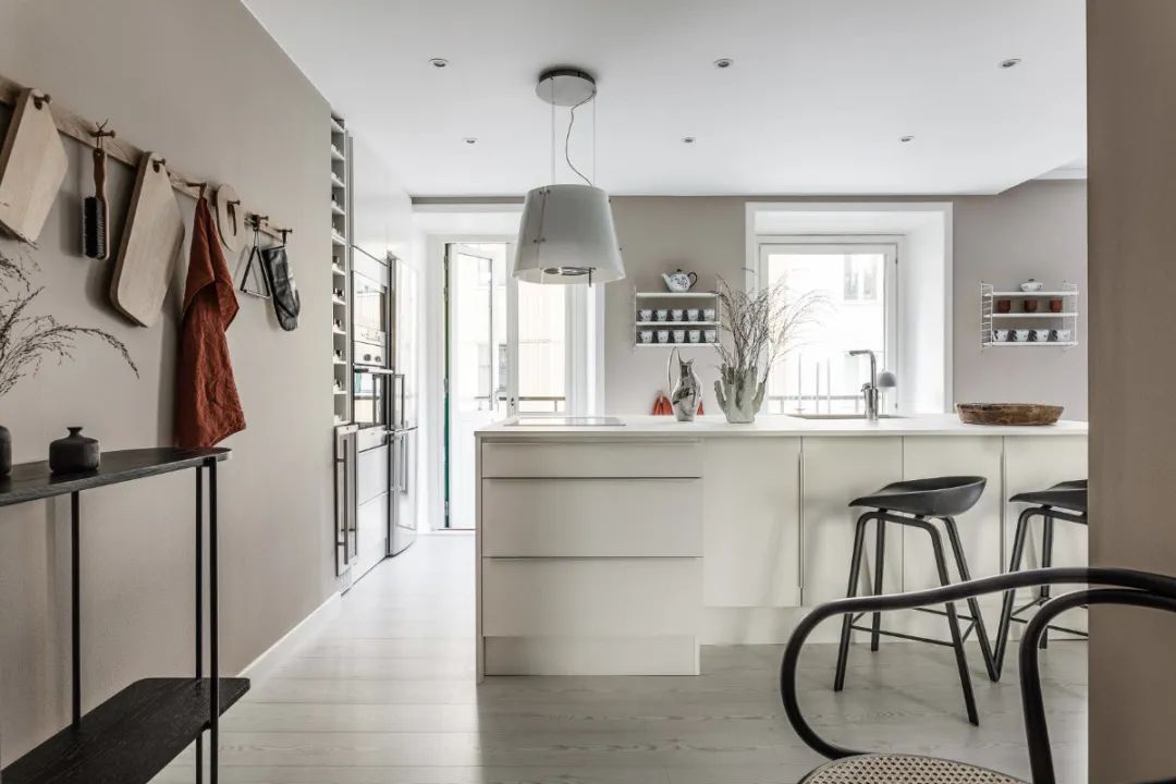 ▲西厨区后方的卫生间门,还有侧边墙面的木质挂钩,挂上案板厨具,简约自然的质感,也带来独特优雅的设计体验。
