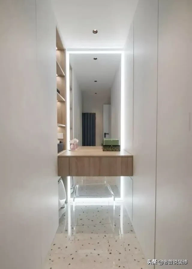 步入式衣帽间两侧是柜子,底部梳妆台相连,一面顶天立地的大镜子让空间显得不紧凑。