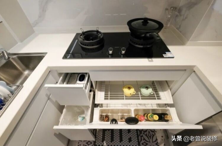 地柜内设“子母”拉篮收纳油烟酱醋调味料,将厨房的整洁度规划到极致。